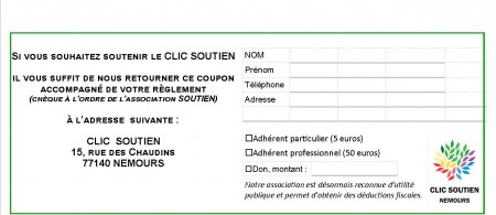 Vous pouvez soutenir le CLIC SOUTIEN en devenant adhérent de notre association, en retournant le coupon accompagné de votre reglèment à l'adresse suivante :